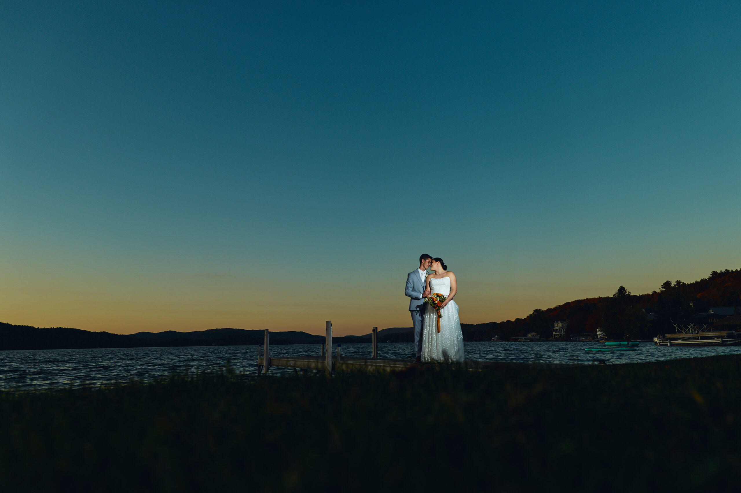The reception was a fantastic party, filled with touching speeches, great music, and plenty of dancing. As the sun began to dip toward the horizon, we snuck out for a few sunset portraits right by the lake, taking advantage of that gorgeous golden light. Afterward, it was straight back to the celebration, where the dance floor remained packed for the rest of the night.